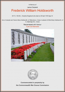 - He enlisted in Crewe 27th Nov 1915 at age 33 and joined the 11th Battalion Cheshire Regiment but transferred to 13th Battalion early in 1917.